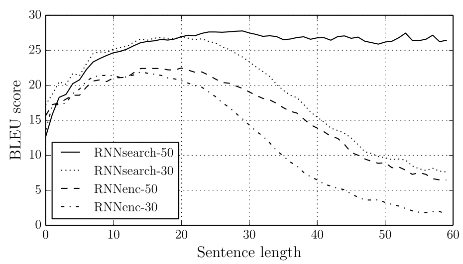Note how fast the performance of the RNNenc models (i.e., RNNenc-30 and RNNenc-50). See how RNNsearch-50 keeps having a stable and solid performance irrespective of the input sequence (I think it will drop eventually if we go beyon sequence of lengh of 60, however, it is beating all others pretty impressively!).